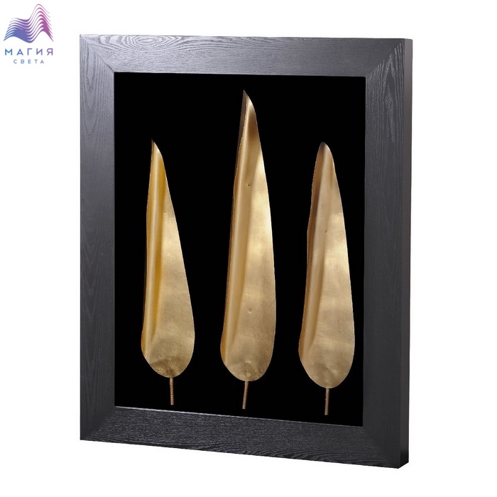 Настенное панно от бренда Mart Gallery "Три золотых листа" изготовлено из черной деревянной рамы и стекла, цвет листьев - золото.