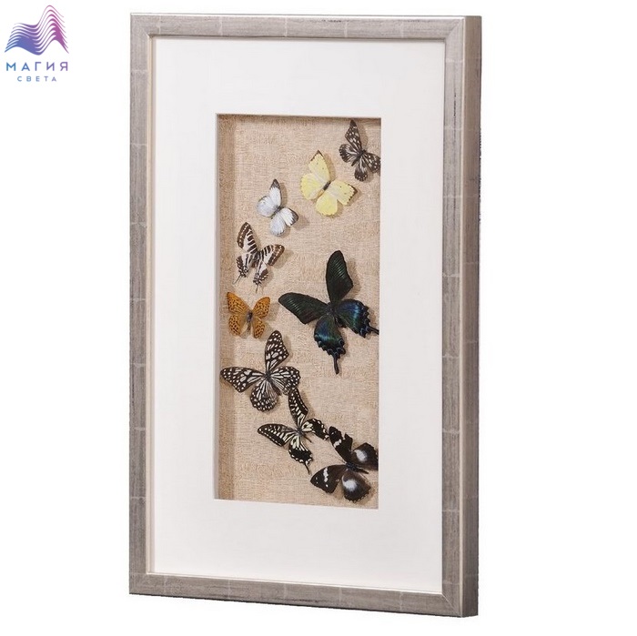 Настенное панно из засушенных бабочек в раме из шпонированного МДФ под стеклом. Цвет рамы - бежевый с текстурой дерева. Подложка выполнена из фанеры, обтянутой холстом бежевого цвета, паспарту выполнено из картона кремового цвета.