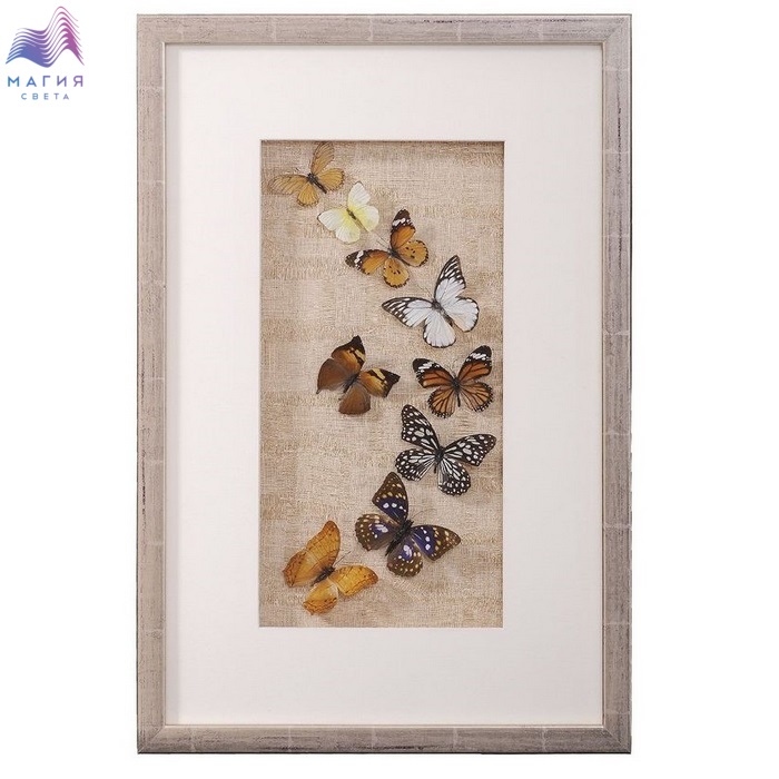 Настенное панно из засушенных бабочек в раме из шпонированного МДФ под стеклом. Цвет рамы - бежевый с текстурой дерева. Подложка выполнена из фанеры, обтянутой холстом бежевого цвета, паспарту выполнено из картона кремового цвета.