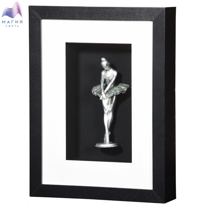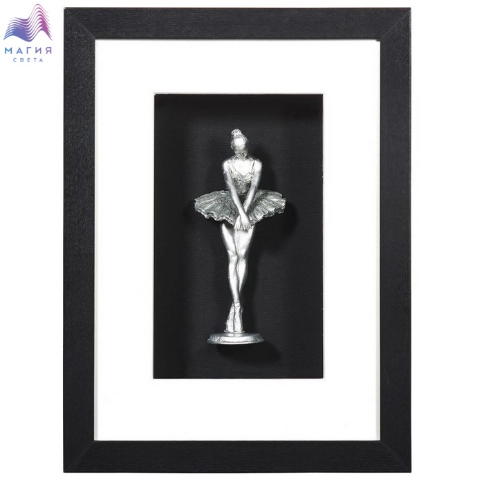 Настенное панно из композитного материала в раме из шпонированного МДФ под стеклом. Цвет рамы - черный с текстурой дерева, цвет панно - серебро патинированное. Подложка выполнена из фанеры, обтянутой холстом черного цвета, паспарту выполнено из картона обтянутого холстом бежевого цвета.