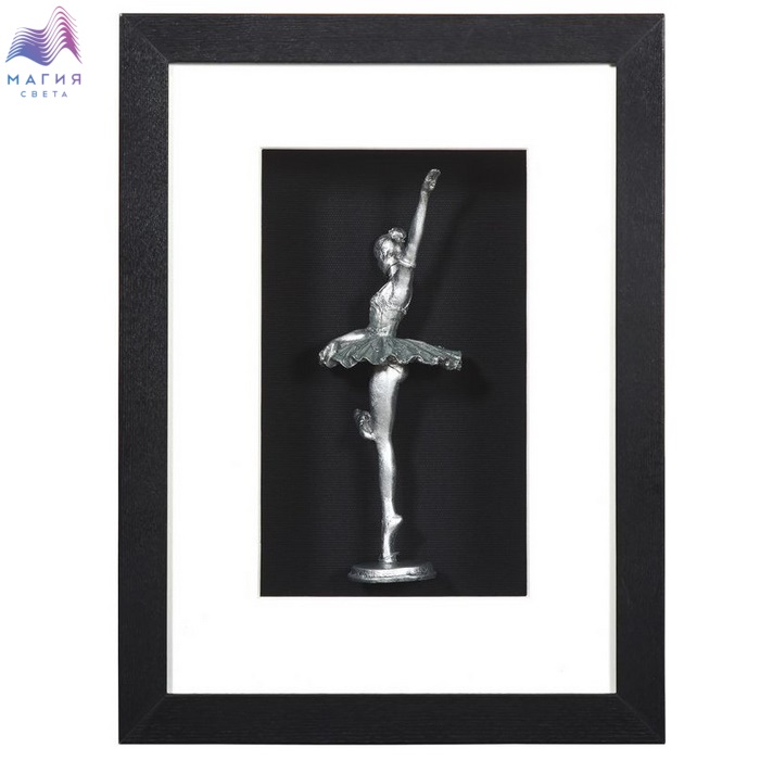 Настенное панно из композитного материала в раме из шпонированного МДФ под стеклом. Цвет рамы - черный с текстурой дерева, цвет панно - серебро патинированное. Подложка выполнена из фанеры, обтянутой холстом черного цвета, паспарту выполнено из картона обтянутого холстом бежевого цвета.