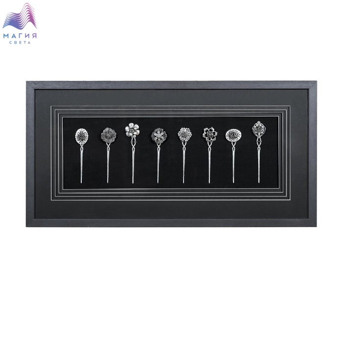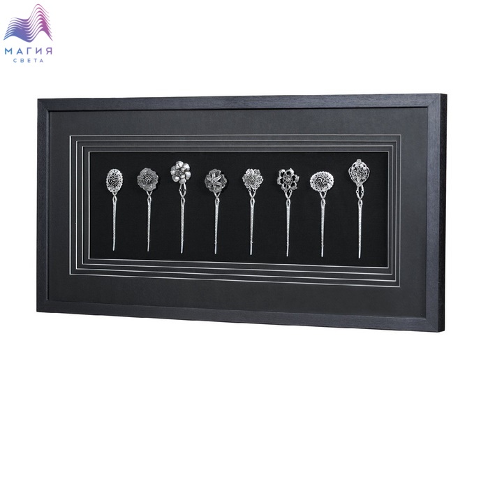 Настенное панно Mart Gallery "Булавки 1" 18906B изготовлено из металла в раме из шпонированного МДФ под стеклом. Цвет рамы - черный с текстурой дерева, цвет панно - серебро. Подложка выполнена из фанеры, обтянутой черным холстом. Паспарту выполнено из черного платика в четыре слоя.