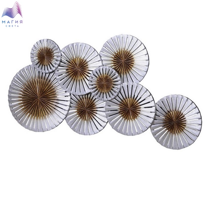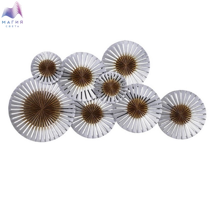 Панно "Цветочная поляна" - настенное панно из фрезерованного МДФ. Цвет панно - серебро и золото. Панно состоит из восьми кругов, которые соеденены на направляющих. Данное панно можно повесить как вертикально, так и горизонтально.