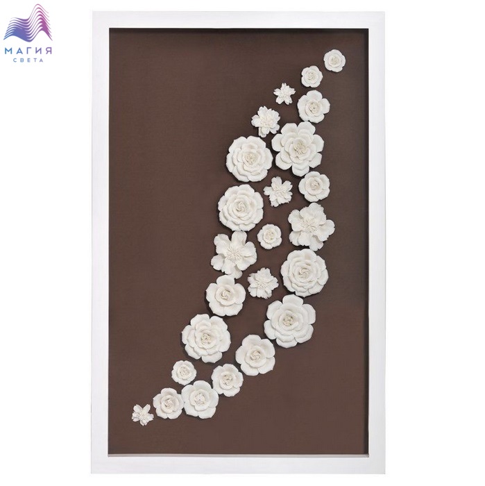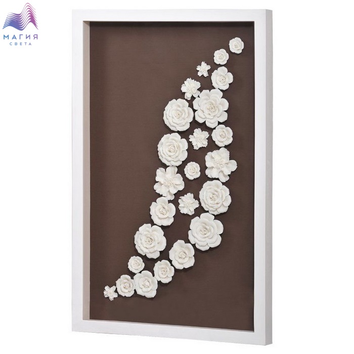 Панно "Цветочный свод 2" — это настенное панно из керамики в раме из шпонированного МДФ под стеклом. Цвет рамы - белый, цвет панно - белый. Подложка выполнена из фанеры, обтянутой холстом кофейного цвета.