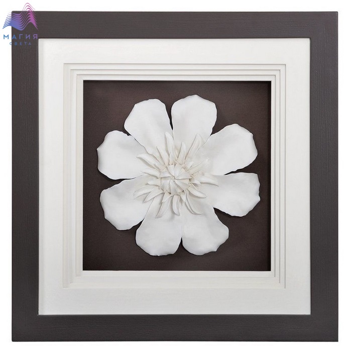 Панно "Цветок 2" —это настенное панно из керамики в раме из шпонированного МДФ под стеклом. Цвет рамы - кофейного цвета, цвет панно - белый. Подложка выполнена из фанеры, обтянутой холстом кофейного цвета. Паспарту выполнено из белого картона в четыре слоя.
