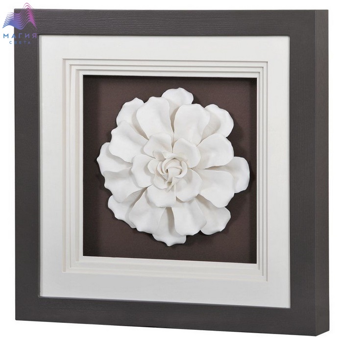 Панно "Цветок 3" — это настенное панно из керамики в раме из шпонированного МДФ под стеклом. Цвет рамы - кофейного цвета, цвет панно - белый. Подложка выполнена из фанеры, обтянутой холстом кофейного цвета. Паспарту выполнено из белого картона в четыре слоя.
