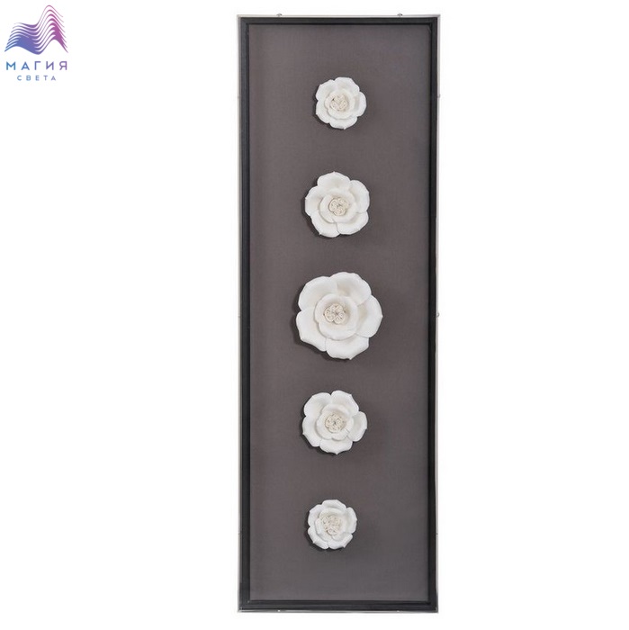 Панно "Цветы счастья 3" — это настенное панно из керамики в стеклянном коробе. Цвет панно - белый. Подложка выполнена из фанеры, обтянутой холстом кофейного цвета .