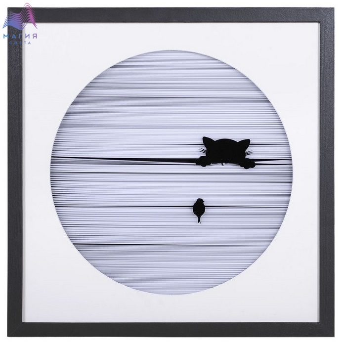 Панно "Кошачья шалость 2" — это настенное панно из атласных лент в раме из шпонированного МДФ под стеклом. Подложка выполнена из фанеры, обтянутой черным холстом. Паспарту выполнено из картона обтянутого холстом белого цвета.