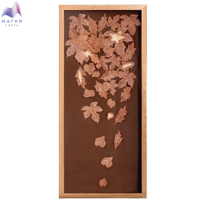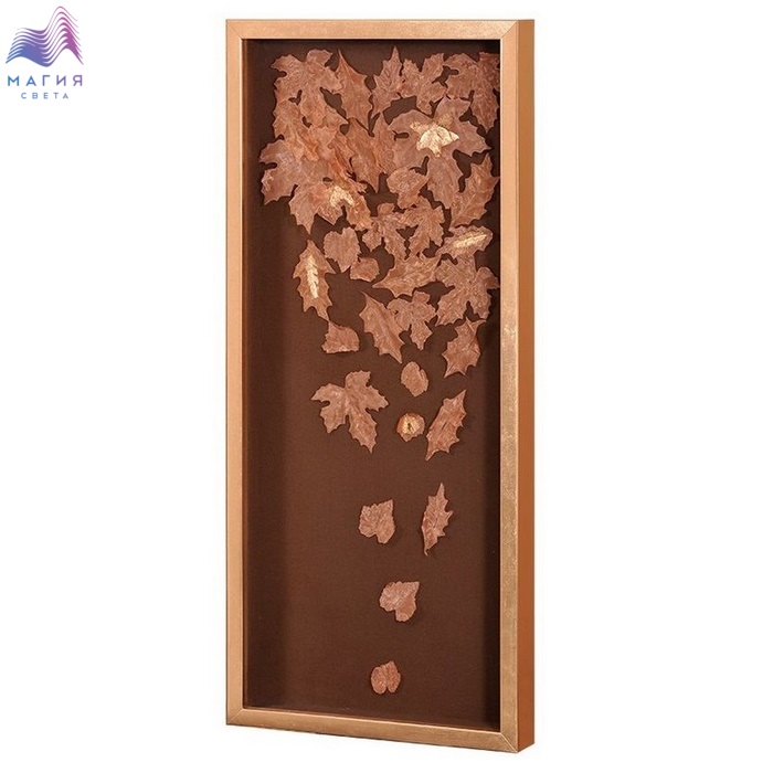 Панно "Листопад 2" — это настенное панно из металлической сетки в раме из шпонированного МДФ под стеклом. Цвет рамы - медный, цвет панно - медный. Подложка выполнена из фанеры, обтянутой холстом кофейного цвета.