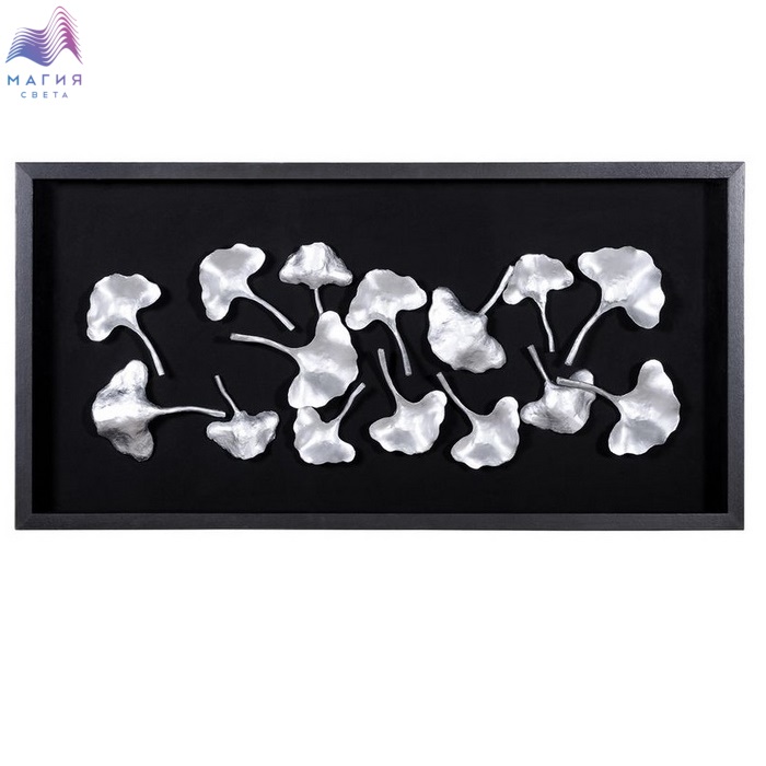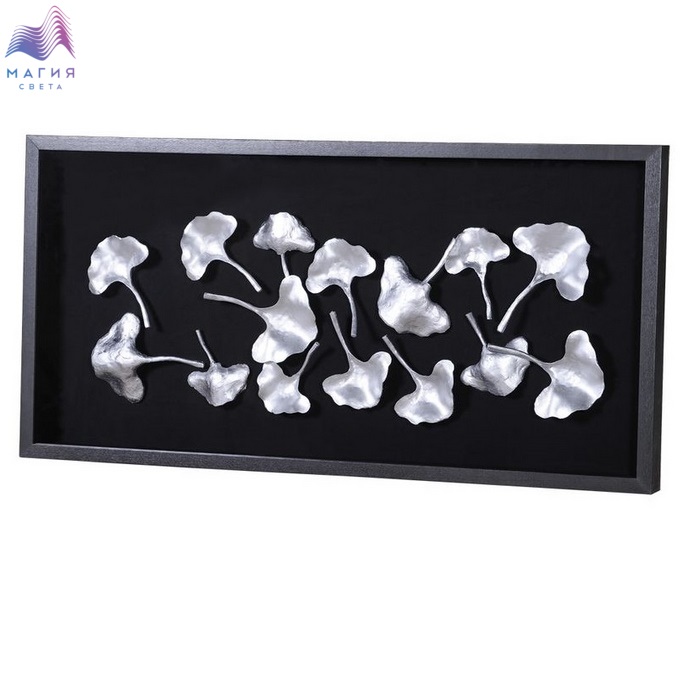 Панно "Лютики полевые" - настенное панно из композитного материала в черной раме из шпонированного МДФ под стеклом. Цвет панно - серебро. Подложка выполнена из фанеры, обтянутой холстом черного цвета.