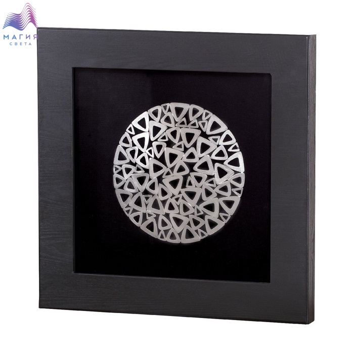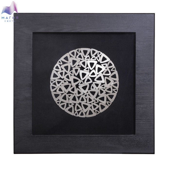Настенное панно Mart Galley "Металлические треугольники" 19468A выполнено из сплава металла серебряного цвета в раме из шпонированного МДФ под стеклом. Цвет рамы - черный с текстурой дерева, цвет панно - серебристый металлик. Подложка выполнена из фанеры обтянутой черным холстом.