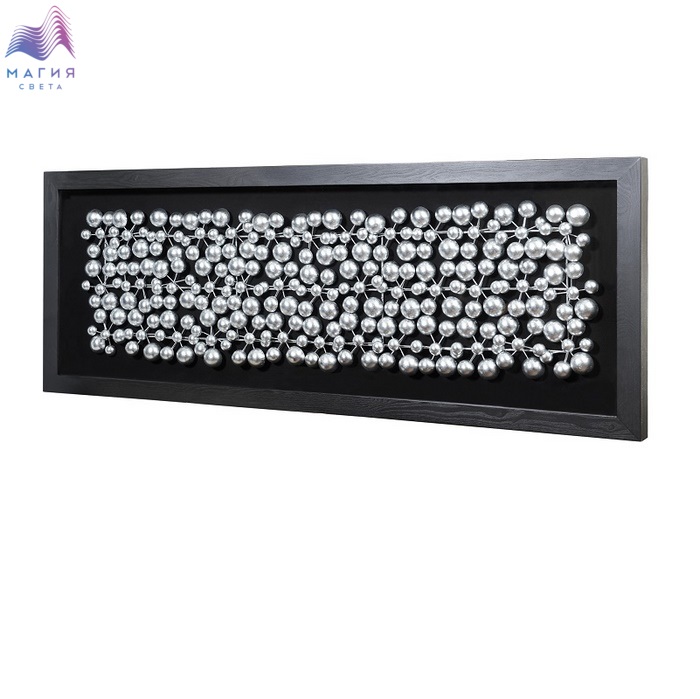 Настенное панно из металла в раме из шпонированного МДФ под стеклом. Цвет рамы - черный с текстурой дерева, цвет панно - серебро. Подложка выполнена из фанеры, обтянутой черным холстом. Данное панно можно вешать на стену как вертикально, так и горизонтально.