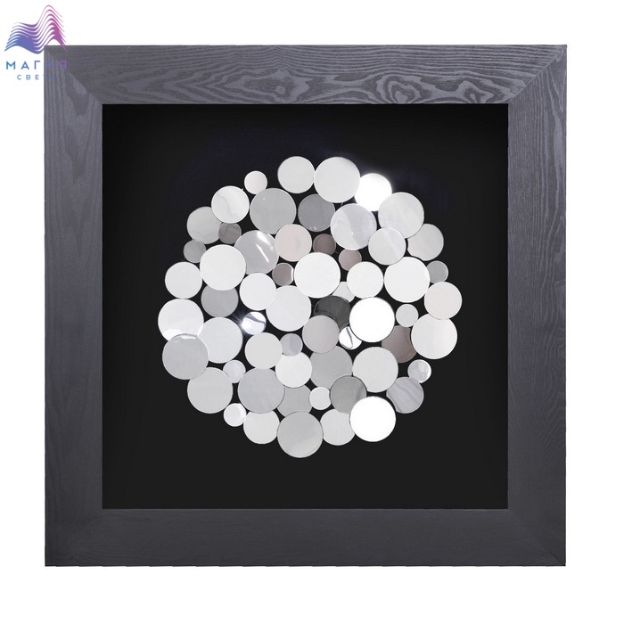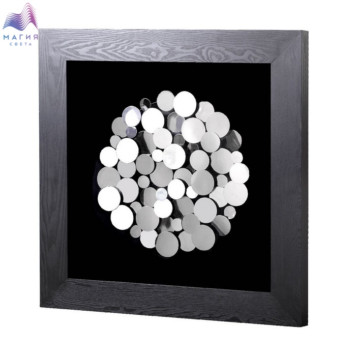 Настенное панно Mart Gallery "Монеты круг" 22155B изготовлено из металла в раме из шпонированного МДФ под стеклом. Цвет рамы - черный с текстурой дерева, цвет панно - серебристый металлик. Подложка выполнена из фанеры, обтянутой черным холстом.
