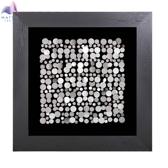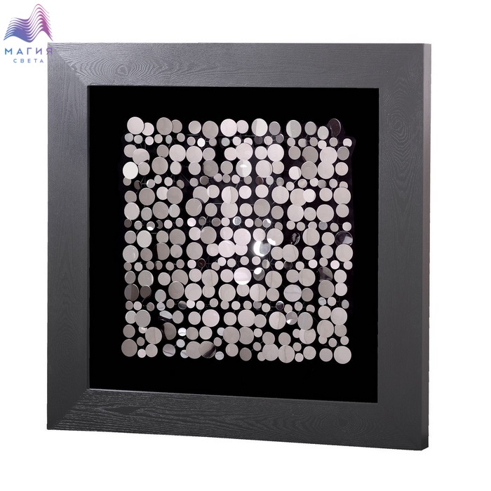 Настенное панно Mart Gallery "Монеты квадрат" 22155A изготовлено из металла в раме из шпонированного МДФ под стеклом. Цвет рамы - черный с текстурой дерева, цвет панно - серебристый металлик. Подложка выполнена из фанеры, обтянутой черным холстом.