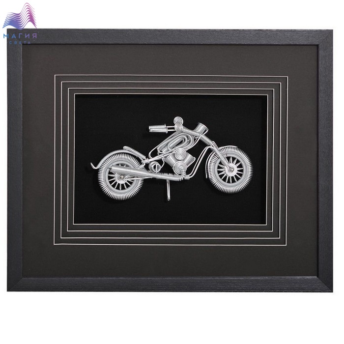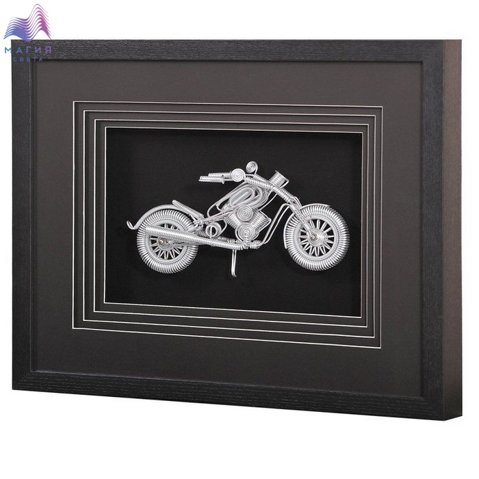Панно "Мотоциклист 1" — это настенное панно из металла в раме из шпонированного МДФ под стеклом. Цвет рамы - черный, цвет панно - серебро. Подложка выполнена из фанеры, обтянутой холстом черного цвета. Паспарту выполнено из картона черного цвета в четыре слоя.