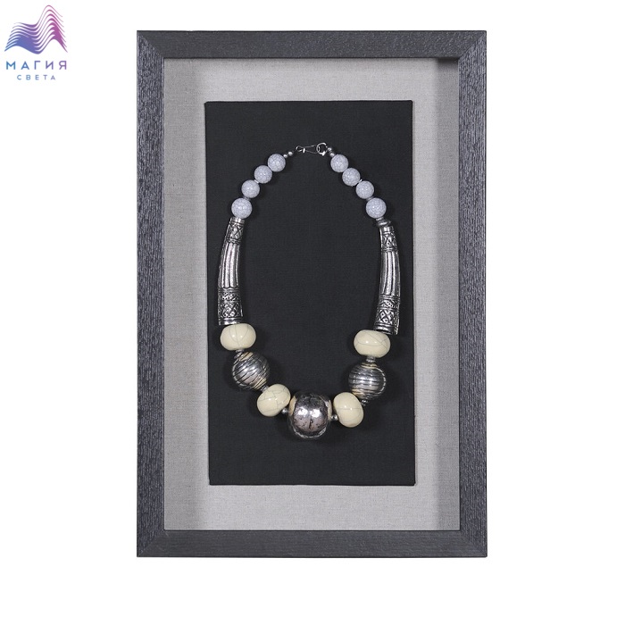 Настенное панно Mart Gallery "Ожерелье 3" 15154C изготовлено из металла в раме из шпонированного МДФ под стеклом. Цвет рамы - черный с текстурой дерева, цвет панно - серебристый металлик. Подложка выполнена из фанеры, обтянутой черным и кремовым холстом.