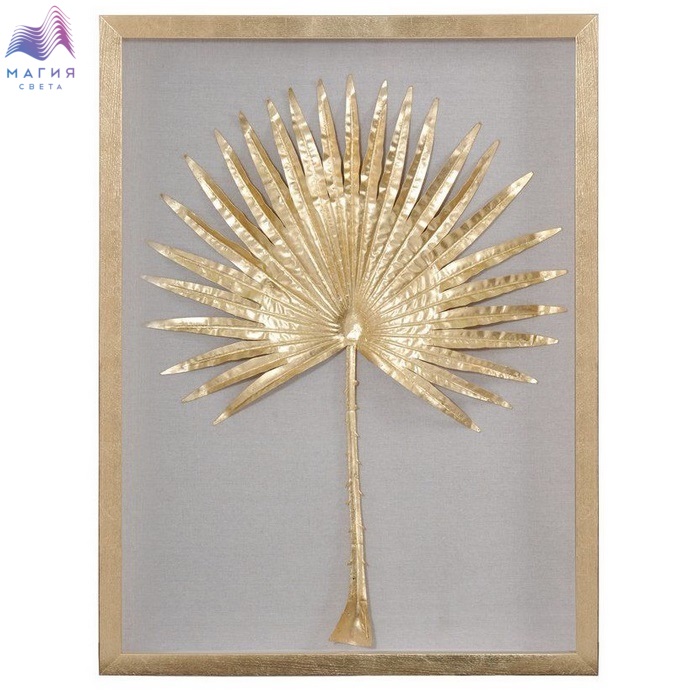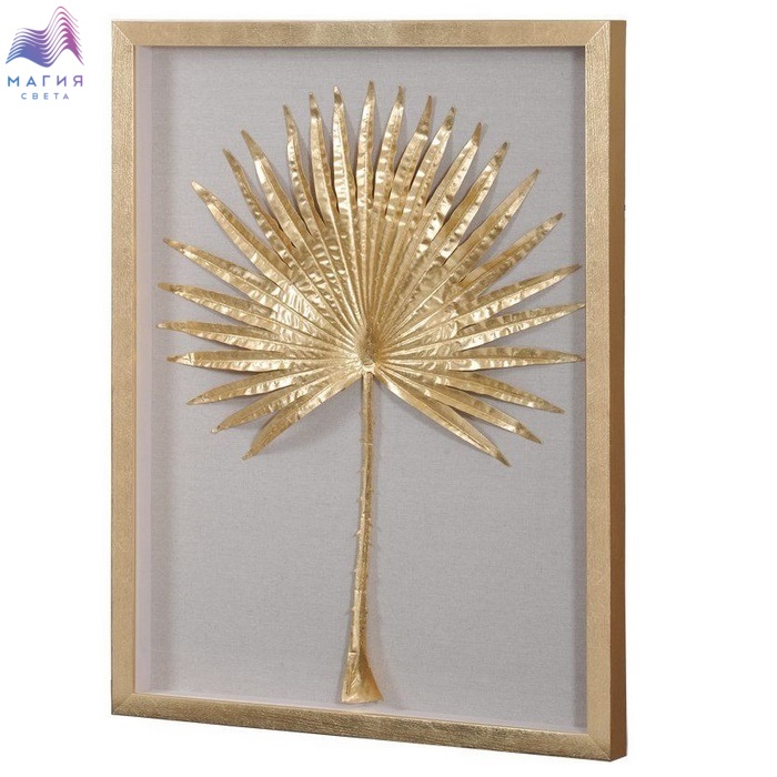 Панно "Пальма 1" — это настенное панно из композитного материала в раме из шпонированного МДФ под стеклом. Цвет рамы - золото, цвет панно - золото. Подложка выполнена из фанеры, обтянутой холстом бежевого цвета. Панно под стеклом.