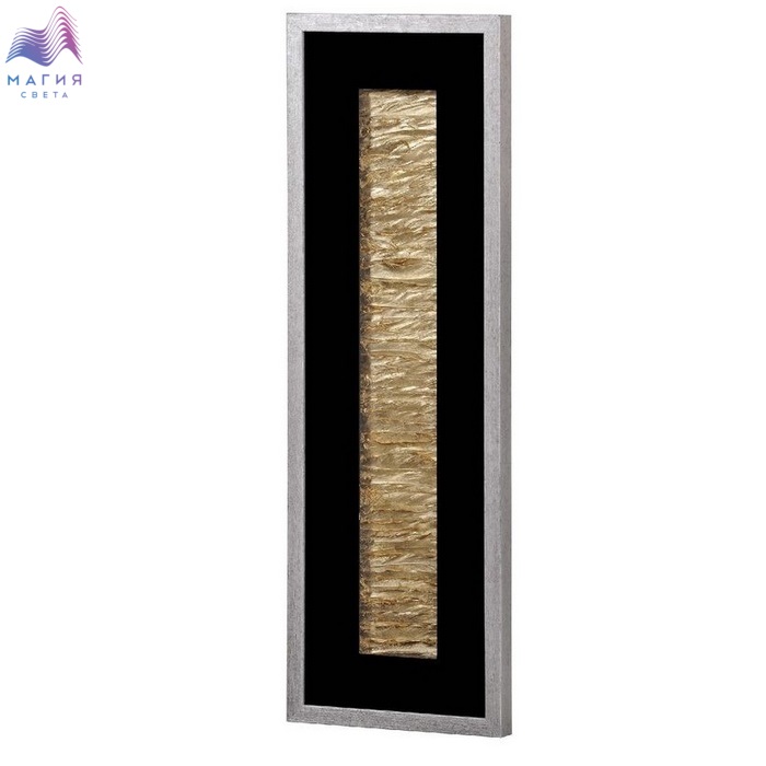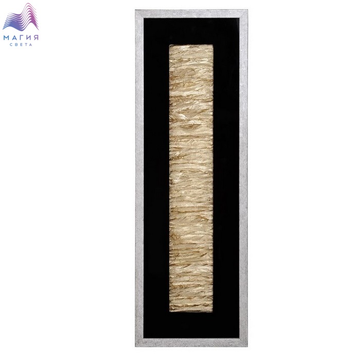 Настенное панно из перьев золотого цвета в раме из шпонированного МДФ под стеклом. Цвет рамы - серебро с патинированием. Подложка выполнена из фанеры, обтянутой холстом черного цвета.