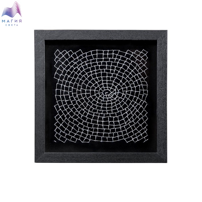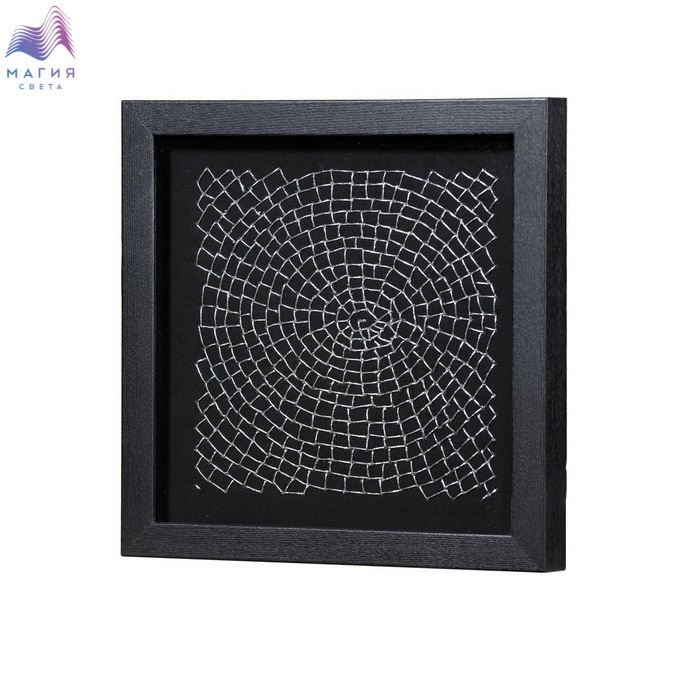 Настенное панно Mart Gallery "Перемещение 1" 22869A изготовлено из нейлоновых серебрянных нитей в раме из шпонированного МДФ под стеклом. Цвет рамы - черный с текстурой дерева, цвет панно - серебро. Подложка выполнена из фанеры, обтянутой черным холстом.
