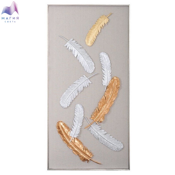 Панно "Перышки 2" — это настенное панно из композитного материала в раме из шпонированного МДФ. Цвет рамы - серебро, цвет панно - бежевого цвета, золото и шампань. Подложка выполнена из фанеры, обтянутой холстомбежевого цвета. Панно без стекла.