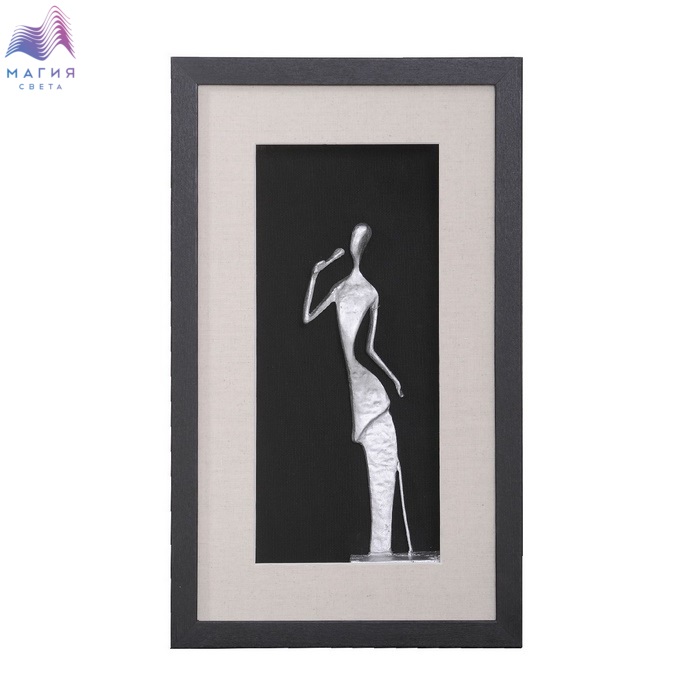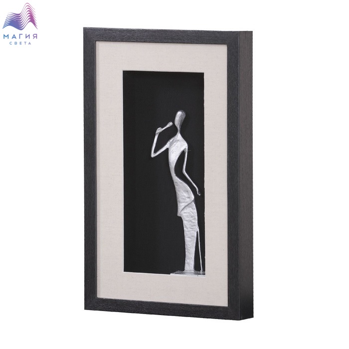 Настенное панно Mart Gallery "Певица" 17422A изготовлено из композитного материала в раме из шпонированного МДФ под стеклом. Цвет рамы - черный с текстурой дерева, цвет панно - серебристый металлик. Подложка выполнена из фанеры, обтянутой черным холстом, паспарту выполнено из пластика, обтянутого бежевым холстом.