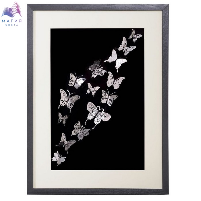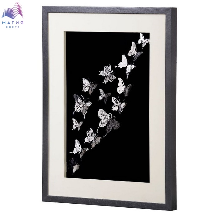 Настенное панно из зеркального металла с червлением в раме из шпонированного МДФ под стеклом. Цвет рамы - черный с текстурой дерева, цвет панно - серебро. Подложка выполнена из фанеры, обтянутой холстом черного цвета с паспарту из бежевого холста.