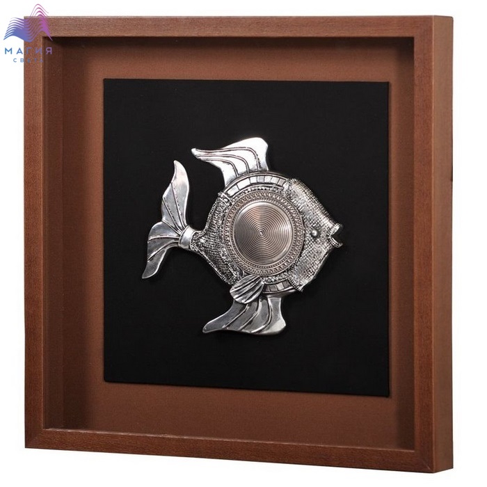 Панно "Рыбка 3" — это настенное панно из металла в раме из шпонированного МДФ под стеклом. Цвет рамы - коричневый, цвет панно - серебро. Подложка выполнена из фанеры, обтянутой холстом черного и кофейного цвета.