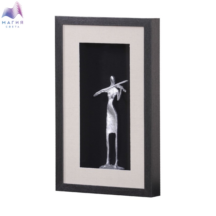Настенное панно Mart Gallery "Скрипачка" 17422B изготовлено из композитного материала в раме из шпонированного МДФ под стеклом. Цвет рамы - черный с текстурой дерева, цвет панно - серебристый металлик. Подложка выполнена из фанеры, обтянутой черным холстом, паспарту выполнено из пластика, обтянутого бежевым холстом.