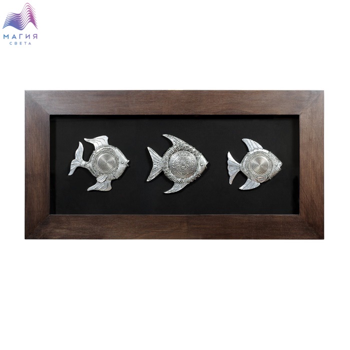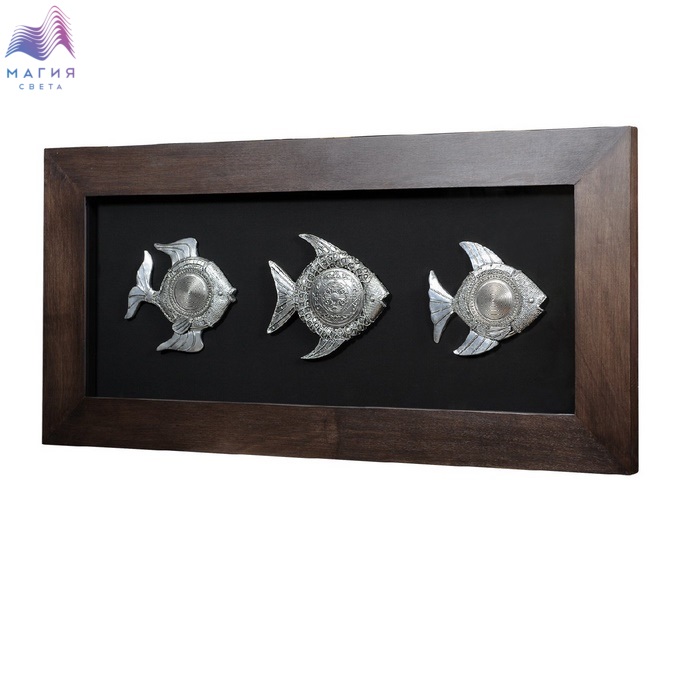 Настенное панно Mart Gallery "Три желания" 15068 изготовлено из металла в раме из шпонированного МДФ под стеклом. Цвет рамы - венге с текстурой дерева, цвет панно - серебро. Подложка выполнена из фанеры, обтянутой черным холстом.