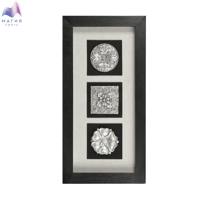 Настенное панно Mart Gallery 17339B "Вертикальный декор 2" черная рама изготовлен из композитного материала в раме из шпонированного МДФ под стеклом. Цвет рамы - черный, цвет панно - серебристый металлик. Подложка выполнена из фанеры, обтянутой черным ибежевым холстом.