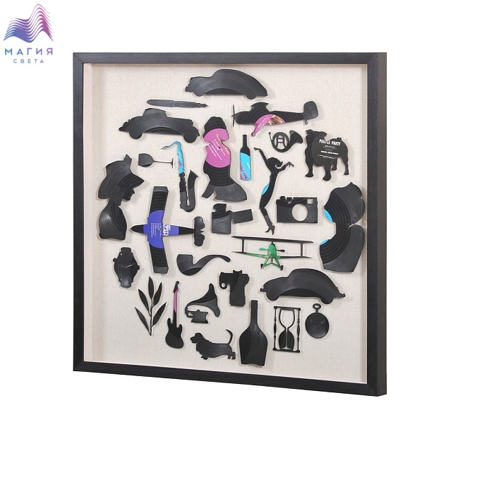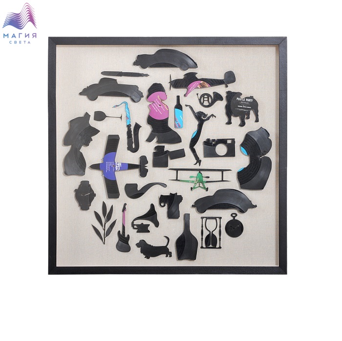 Панно "Виниловая коллекция" — это настенное панно из кусочков виниловых пластинок в раме из шпонированного МДФ под стеклом. Цвет рамы - черный, цвет панно - черный. Подложка выполнена из фанеры, обтянутой холстом бежевого цвета.