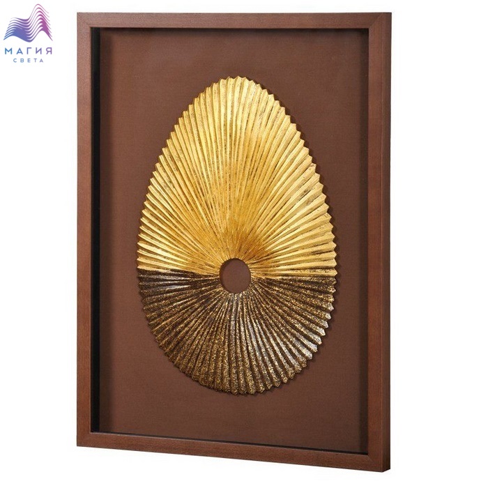 Панно "Яйцо Фаберже" — это настенное панно из фрезерованного МДФ в раме из шпонированного МДФ под стеклом. Цвет рамы - коричневый, цвет панно - золотой и черный. Подложка выполнена из фанеры, обтянутой холстом кофейного цвета. Панно под стеклом.