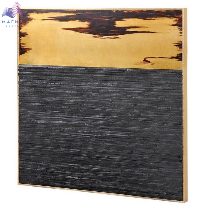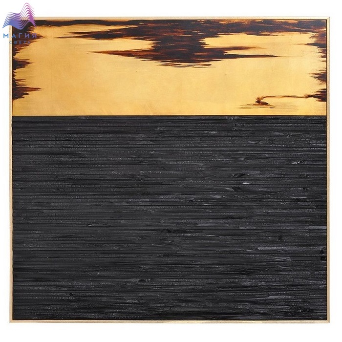 Панно "Закат" — это настенное панно из древесного угля в раме из шпонированного МДФ. Цвет рамы черного цвета, цвет панно - черный и золото. Подложка выполнена из фанеры, окрашенной в золотистые и черные тона.