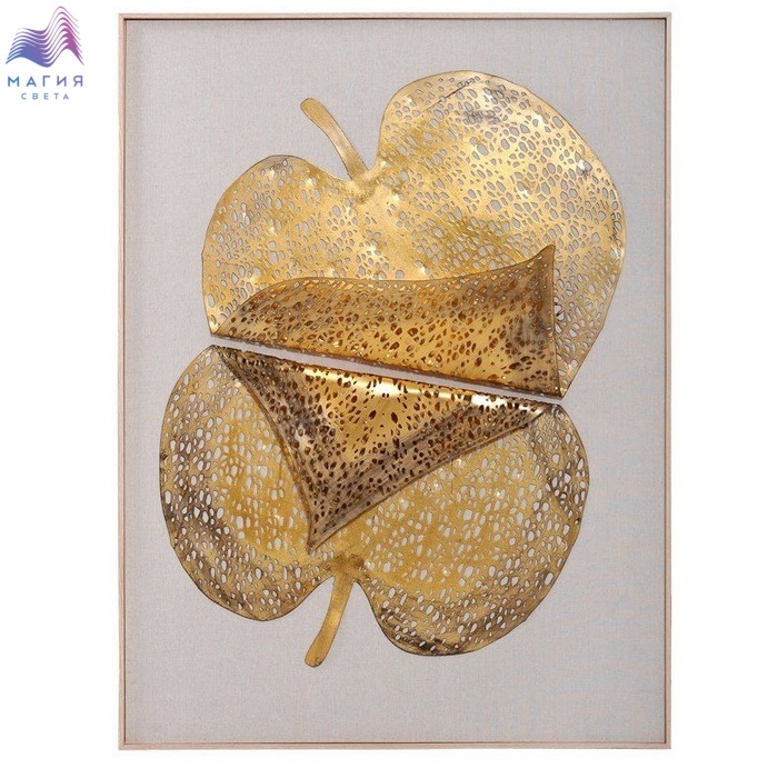 Панно "Золотолиственный узор" — это настенное панно из металла в раме из шпонированного МДФ. Цвет рамы - состаренное золото, цвет панно - золото. Подложка выполнена из фанеры, обтянутой холстом бежевого цвета. Панно без стекла.
