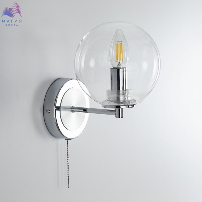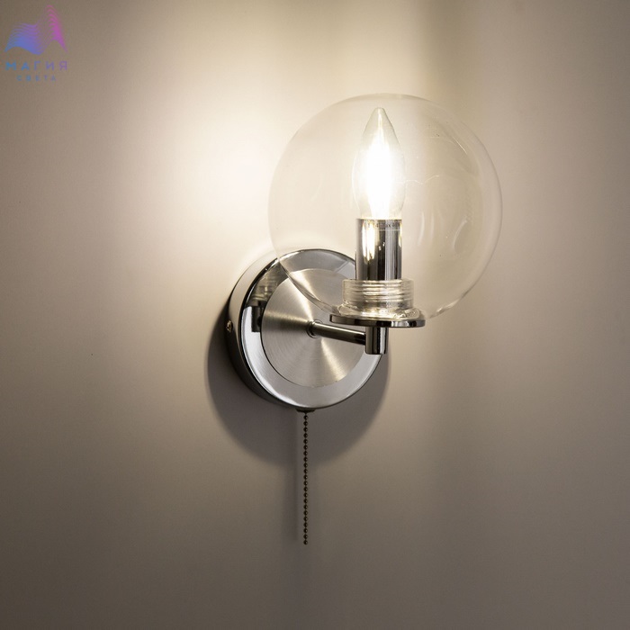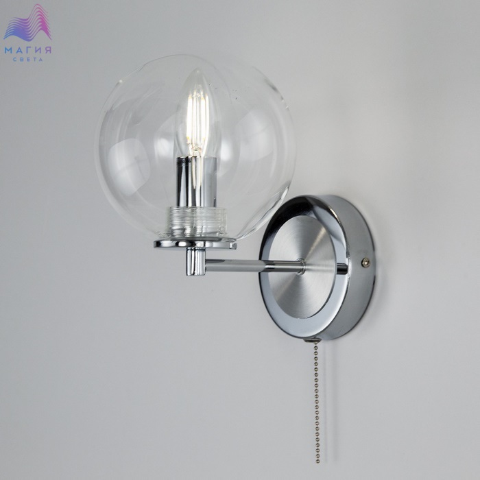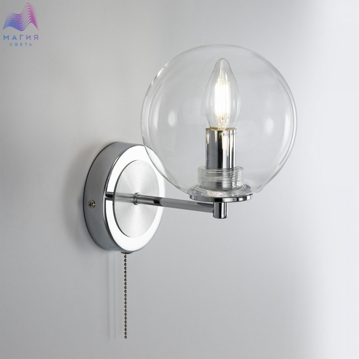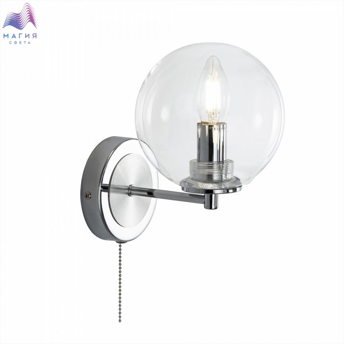 Бра Citilux Галлен CL240311 исполнено в цвете хром. Абажур выполнен из прозрачного стекла. Светильник оснащен выключателем-шнурком.