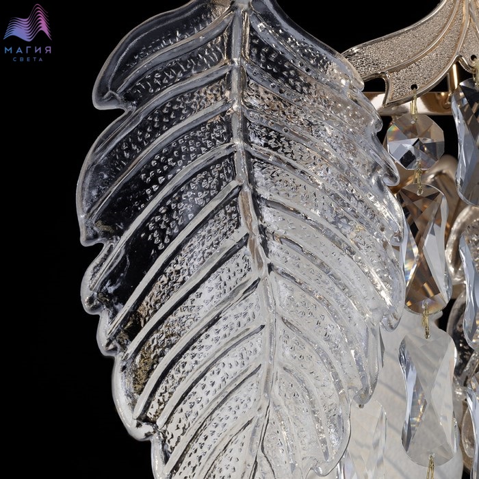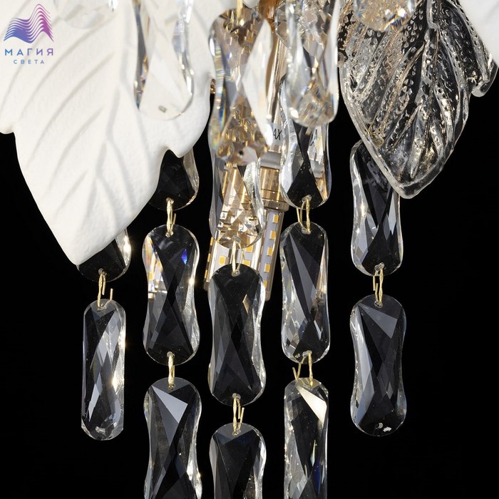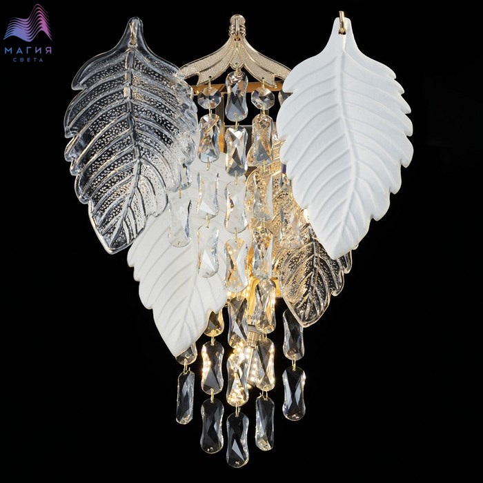 Бра Citilux Darby CL309342. Материал: металл/стекло/хрусталь. Цвет: золото/белый/прозрачный. Настенный светильник украшен каскадом хрустальных подвесок и стеклянными листьями.