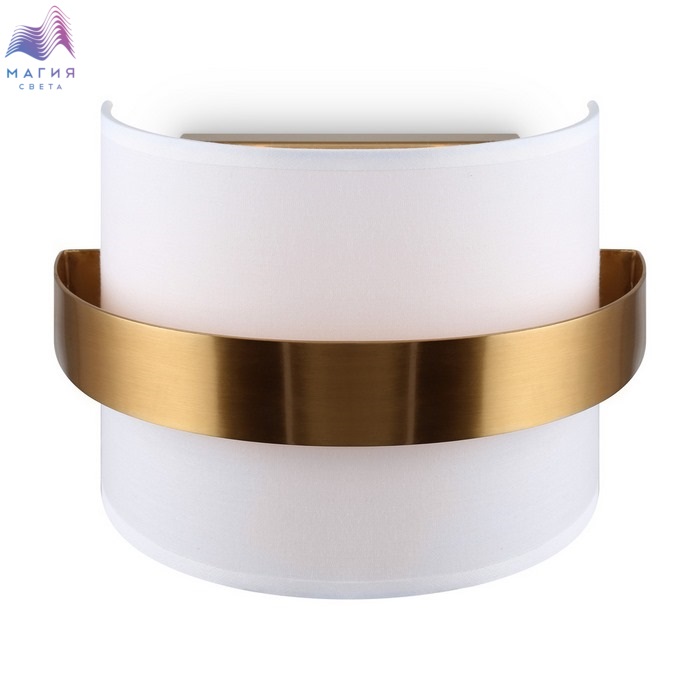 Серия Freya Bride. Металлическая арматура, цвет - латунь. Круглый широкий праздничный абажур из ткани белого цвета. Декоративная парящая окантовка из металла в цвет арматуры. Регулируется по длине. Компактные размеры подходят для низких потолков и небольших интерьеров. Источник света — лампа с цоколем Е14.