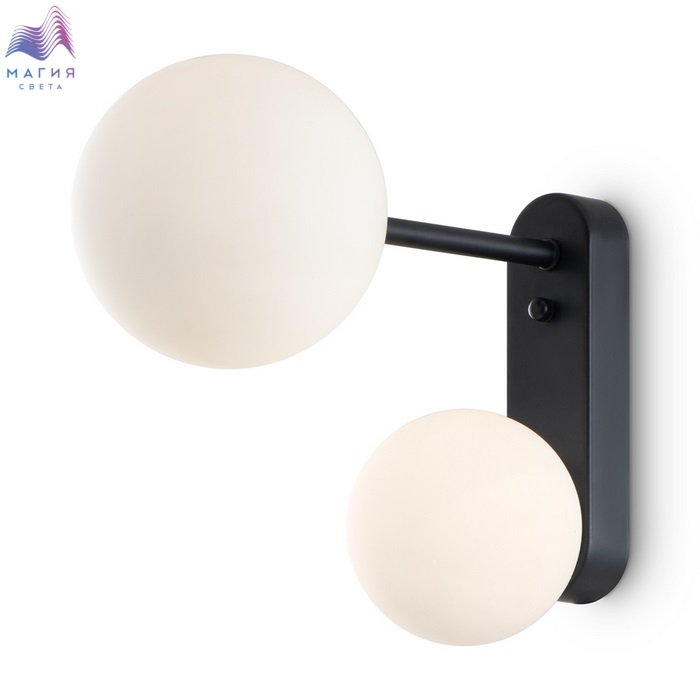 Серия Freya Sphirity. Металлическая арматура покрыта черной краской с золотистыми вставками. Круглые плафоны из белого матового стекла обеспечивают мягкое заливное освещение. На корпусе бра удобная кнопка для включения. Дизайн — минималистичный Источник света — лампа с цоколем G9.