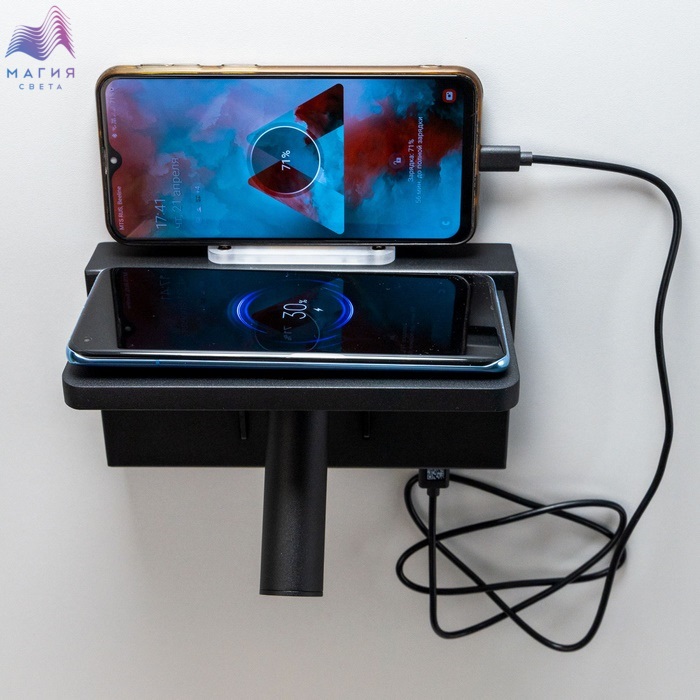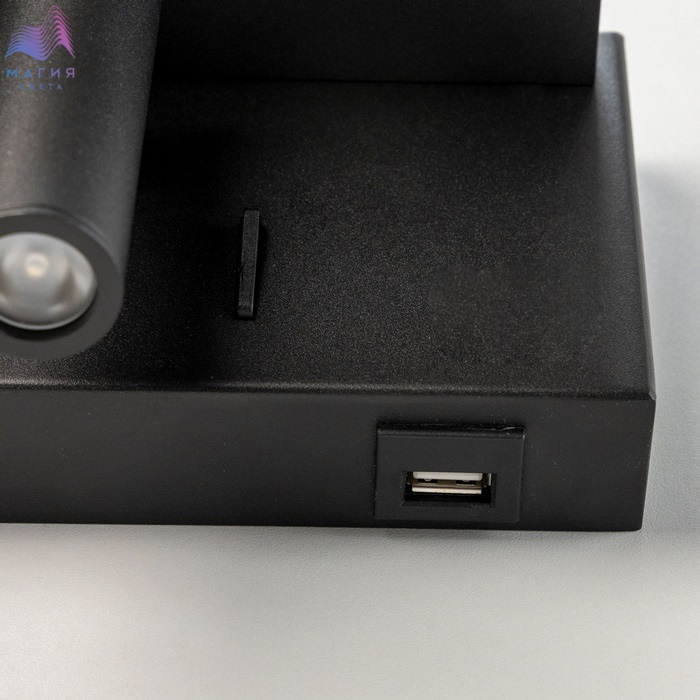 Бра Citilux Декарт CL704371 USB Qi с подсветкой для чтения. Корпус - металл, цвет - чёрный матовый. В изделии 2 источника света. Верхняя подсветка, для общего освещения, мощностью 3Вт. Нижняя направленная, поворотная подсветка, для акцентного освещения, мощностью 3Вт. Обе подсветки с выключателями. Модель оснащена удобной беспроводной зарядкой для смартфонов стандарта Qi мощностью 10Вт и USB выходом 5В/2А.