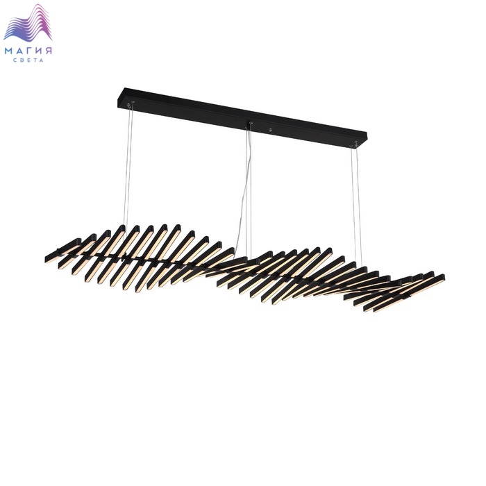 Подвесные светильники ST luce Picodi имеют волнообразную форму. Каркас состоит из тонких металлических реек, дополненных акриловыми рассеивателями. Светильник покрыт черной краской. Данные модели будут особенно уместны над длинным столом.