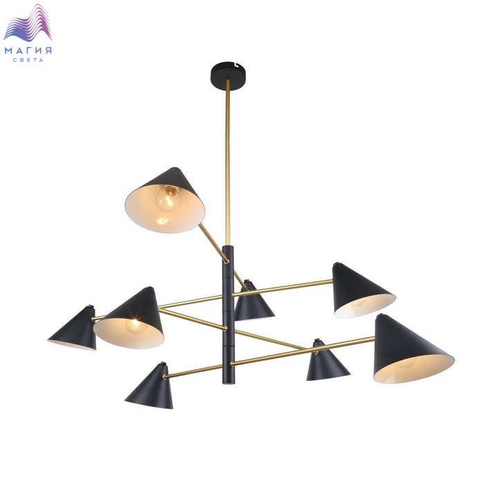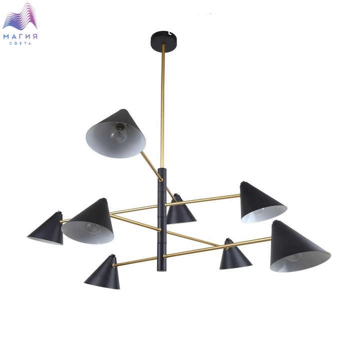 Люстры и бра серии F-promo Trikonoya полностью изготовлены из металла. Строгий каркас матового черного и золотого цветов кажется невесомой. Конусообразные плафоны направляют свет вниз.