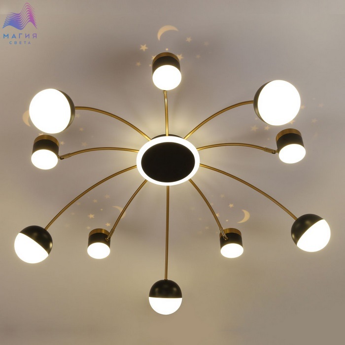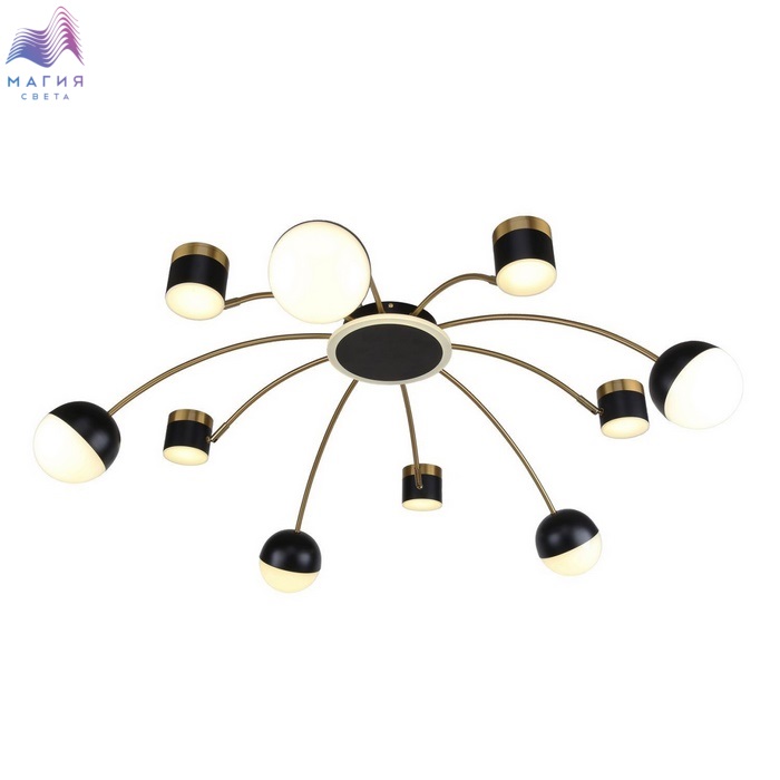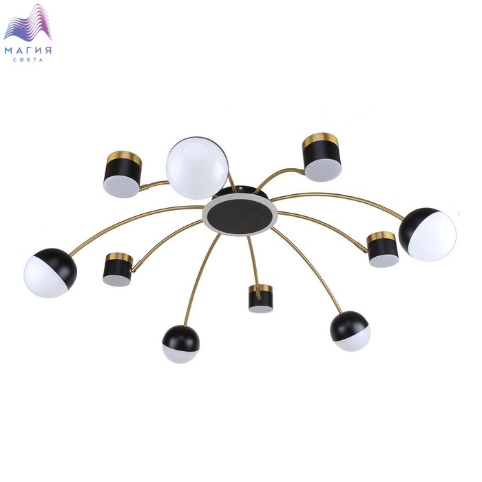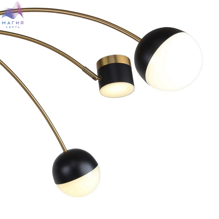 Потолочные люстра F-promo Canvas исполнены в современном стиле. Металлическое основание матового черного цвета дополнено золотыми рожками, направленные в разные стороны. Плафоны двух типов: одни - в форме шара, вторые - цилиндрические.