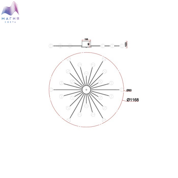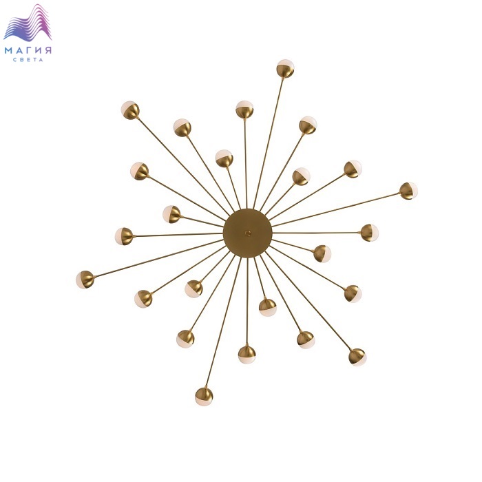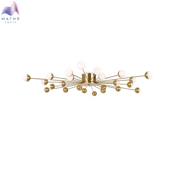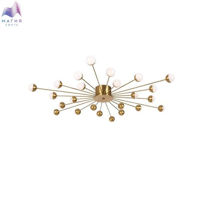 Freya Celebrity ー это изобретательное произведение искусства. Источник света представлен двумя видами плафонов: двойное стекло и акриловое стекло в сочетании с латунной металлической окантовкой. Эти маленькие огоньки раскинуты по всей площади светильника и создают ощущение, что в вашей квартире есть свое небольшое звёздное небо. Плафоны расположены на концах арматур, которые по кругу выходят из цилиндра в центре. Материал плафонов: стекло, акрил. Цвета арматуры: черный и золото.