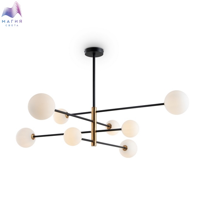 Серия Freya Sphirity. Металлическая арматура покрыта черной краской с золотистыми вставками. Круглые плафоны из белого матового стекла обеспечивают мягкое заливное освещение. На корпусе бра удобная кнопка для включения. Дизайн — минималистичный Источник света — лампа с цоколем G9.
