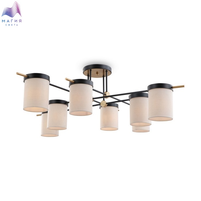 Серия Freya Bogy. Арматура из металла. Основной цвет - черный, декоративные элементы в цвете латунь. Тканевые бежевые абажуры-цилиндры украшены черными металлическими основаниями. Компактные размеры для невысоких потолков.