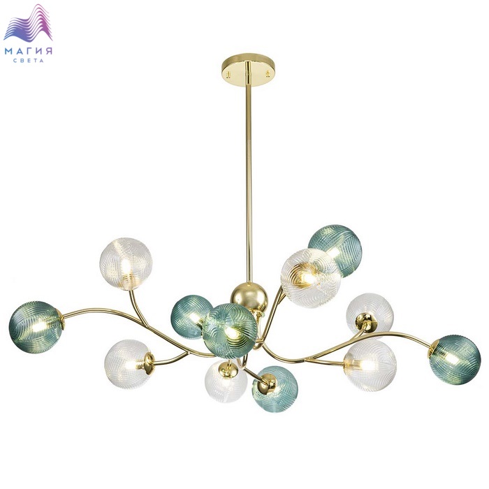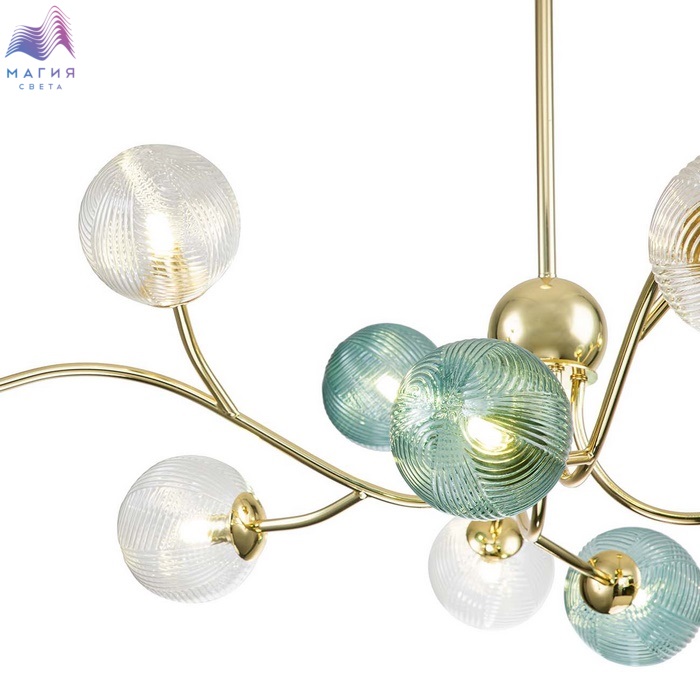 Коллекция INDIGO Selva позволяет внести нотки природной красоты в ваш интерьер. Золотой каркас с элегантными изгибами напоминает ветки, на которых красуются зеленые и прозрачные плафоны с разнообразной текстурой.
