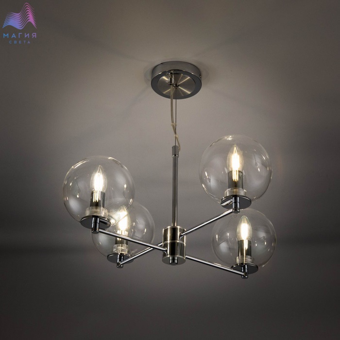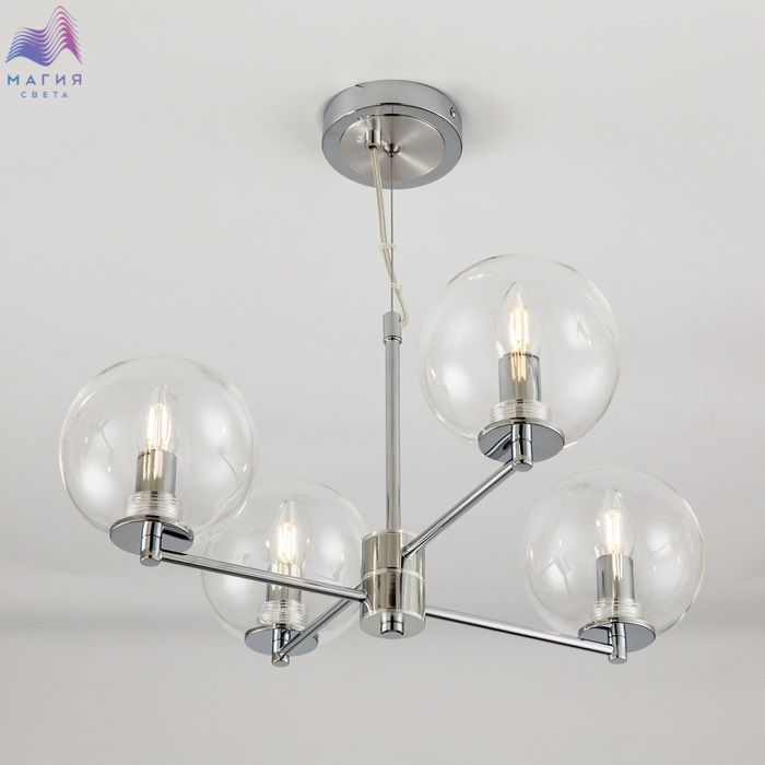 Подвесная люстра Citilux Галлен CL240141 исполнена в цвете хром. Конструкция светильника проста: она представляет собой центральный стержень, к которому прикреплены перекрестные металлические рожки, на которые установлены плафоны. Абажуры выполнены из прозрачного стекла. Длина провода и троса регулируется при установке.