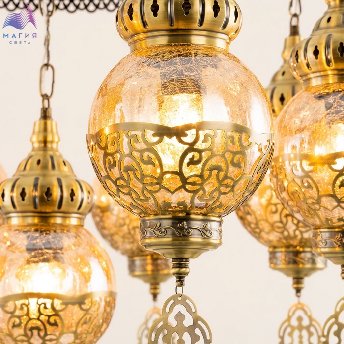 Восточная каскадная люстра Citilux Каир CL419183 с девятью подвесными плафонами. Каркас металлический, цвет бронза. Плафоны в форме шара, изготовлены из прозрачного стекла медового оттенка, украшены декоративными, ажурными элементами.