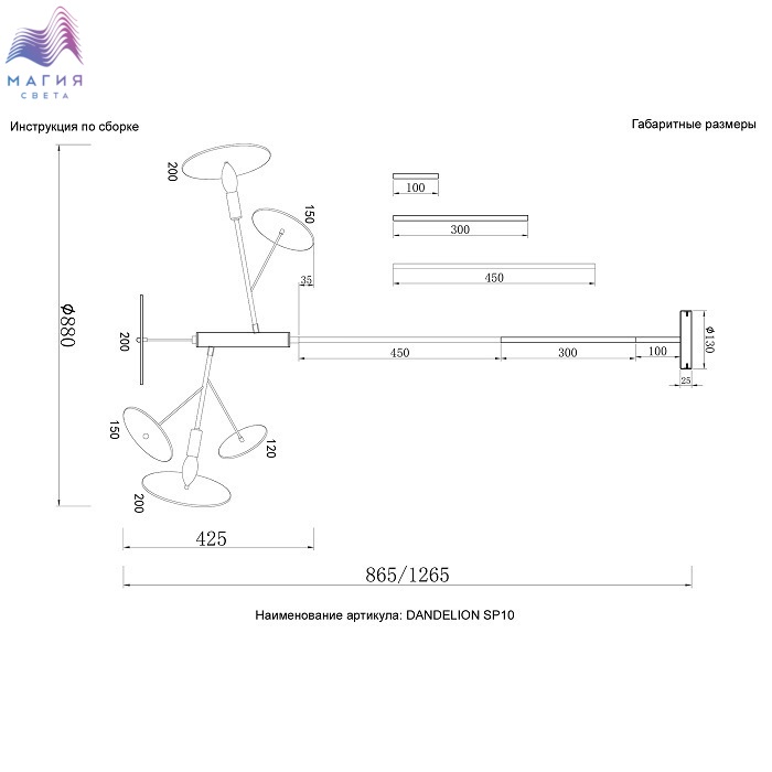 В комплектацию люстр входит наборный центральный шток, состоящий из сегментов 100+300+450мм.