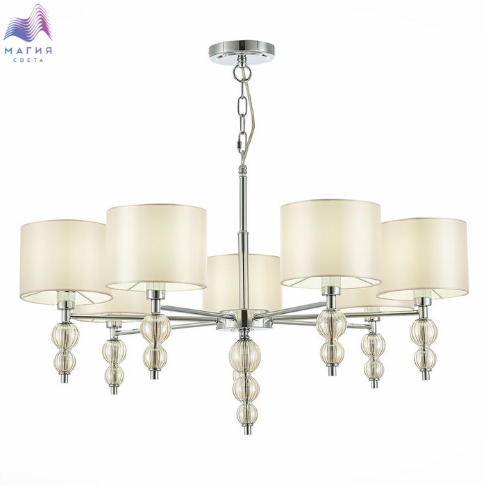 Коллекция Evoluce Ramer обладает лаконичным и изысканным дизайном. Прямые рожки украшены прозрачными сферами из стекла с легким янтарным оттенком, который гармонирует с кремовыми атласными абажурами. Высота люстр регулируется длиной цепи.